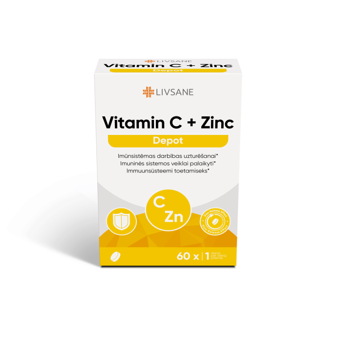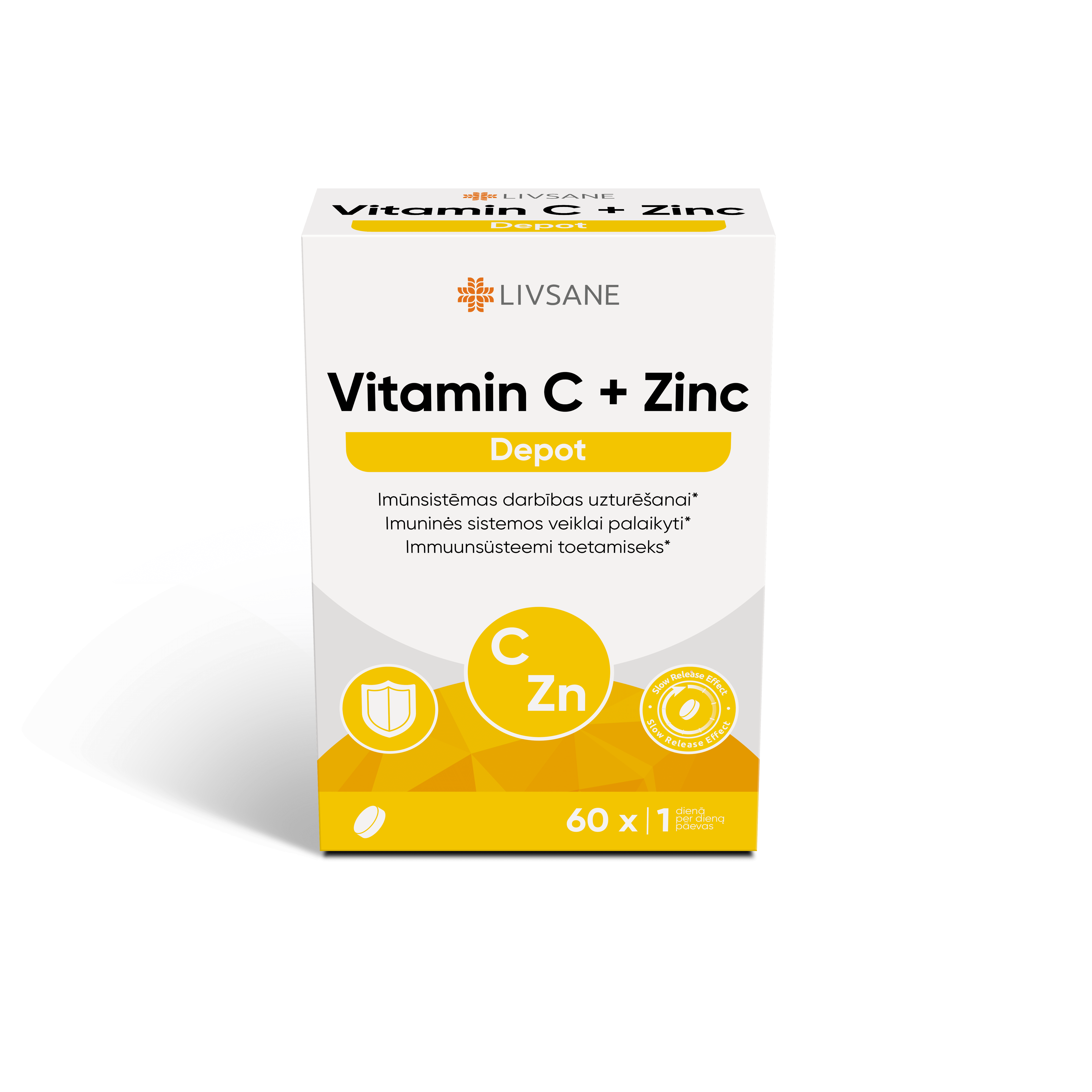 LIVSANE C vitamiin + tsink-depoo tabletid toetavad immuunsüsteemi normaalset funktsiooni ja aitavad kaitsta rakke oksüdatiivse stressi eest. Aeglase vabanemisega tagatakse, et vitamiinid ja mineraalid vabanevad viivitusega ja on seetõttu kehale pikema aja jooksul saadaval.