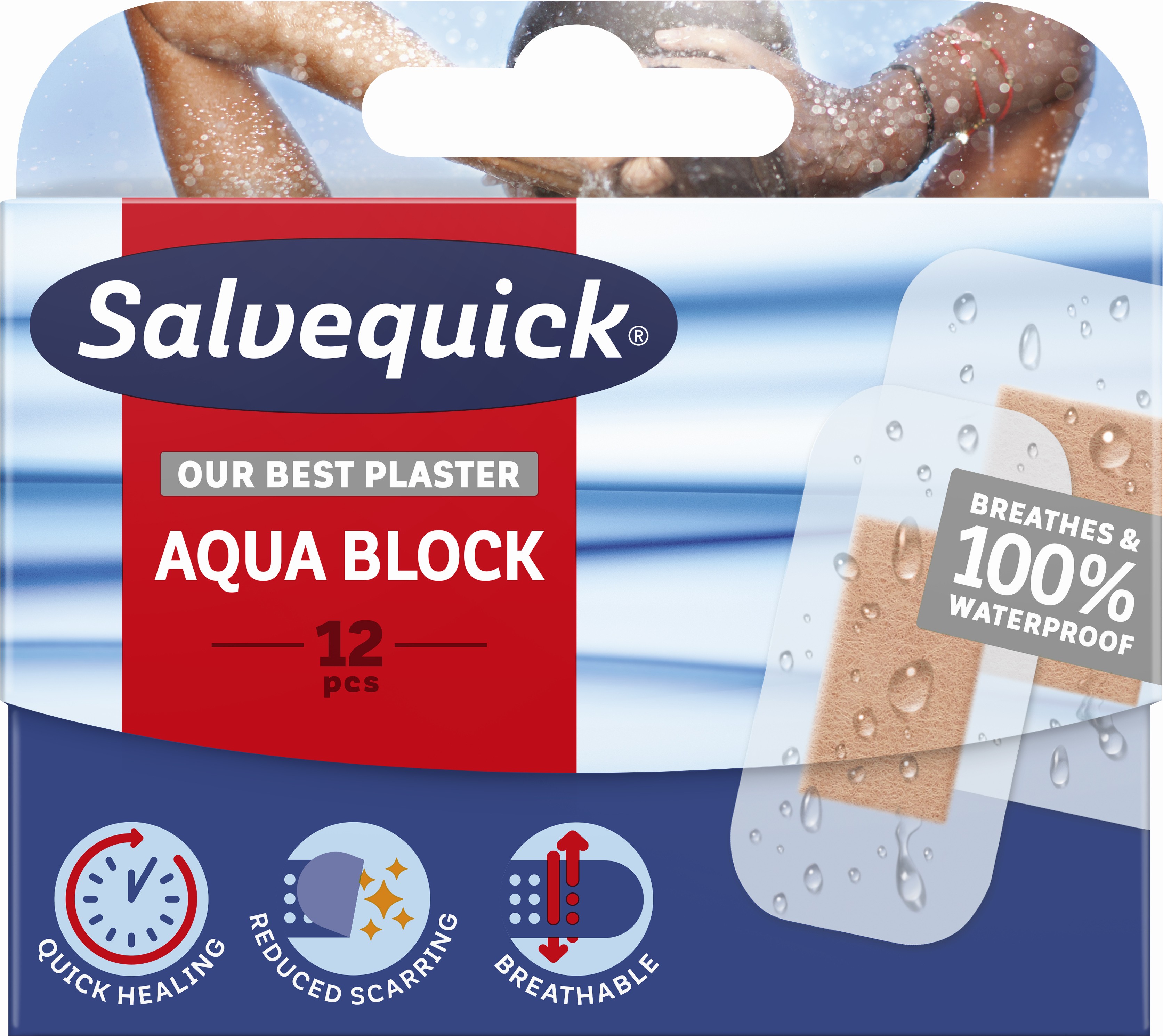 Salvequick plaastrid Aqua Block on 100% veekindlad plaastrid, mis kiirendavad haavade paranemisprotsessi ja vähendavad armistumise ohtu. Üliõhukesed, hingavad ja elastsed plaastrid. Liimiriba plaastri kõikidel külgedel tagab kindla kinnitumise nahale. Kaitsevad haava vee ja mustuse eest. Pakendis on 12 plaastrit kahes erinevas suuruses: