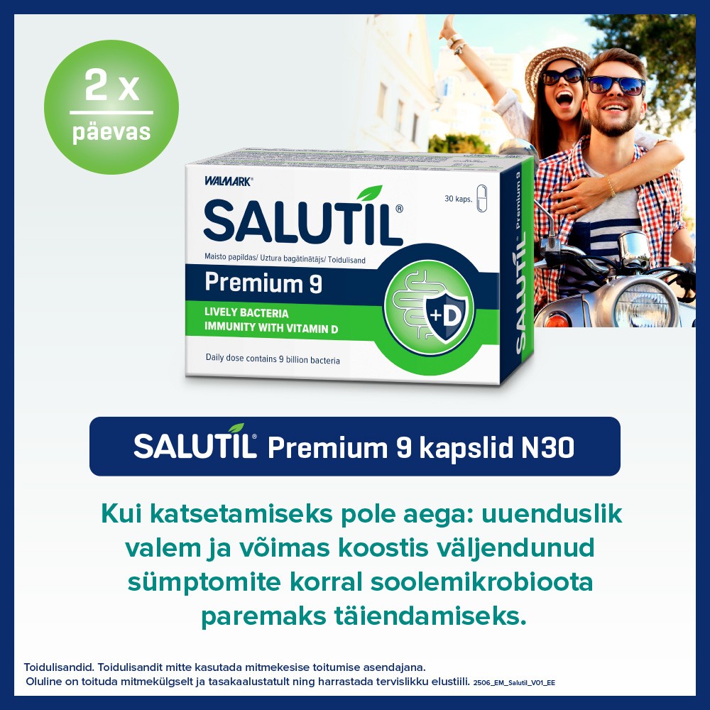 Salutil PREMIUM 9 Toidulisand 30 kapslit • 9 miljardit mikrgoorganismi eluskultuuri päevases annuses • Sobib täiskasvanutele ja lastele alates 3. eluaastast Salutil PREMIUM 9 mikroorganismide kompleks on ainulaadne ja tasakaalustatud kombinatsioon probiootiliste kultuuride, prebiootiliste fruktooligosahhariidide ja D-vitamiini vahel. Sisaldab 9 elutähtsate mikroorganismide tüve päevaannuses 9 miljardit. Bakterite kolooniaid on rikastatud D-vitamiiniga, mis aitab kaasa immuunsüsteemi normaalsele talitlusele. Vitamiin D: - Aitab kaasa immuunsüsteemi normaalsele talitlusele - Aitab hoida luid ja hambaid normaalsetena - Aitab kaasa kaltsiumi ja fosfori normaalsele imendumisele/ärakasutamisele - Aitab hoida lihaste talitlust normaalsena - Osaleb rakujagunemise protsessis