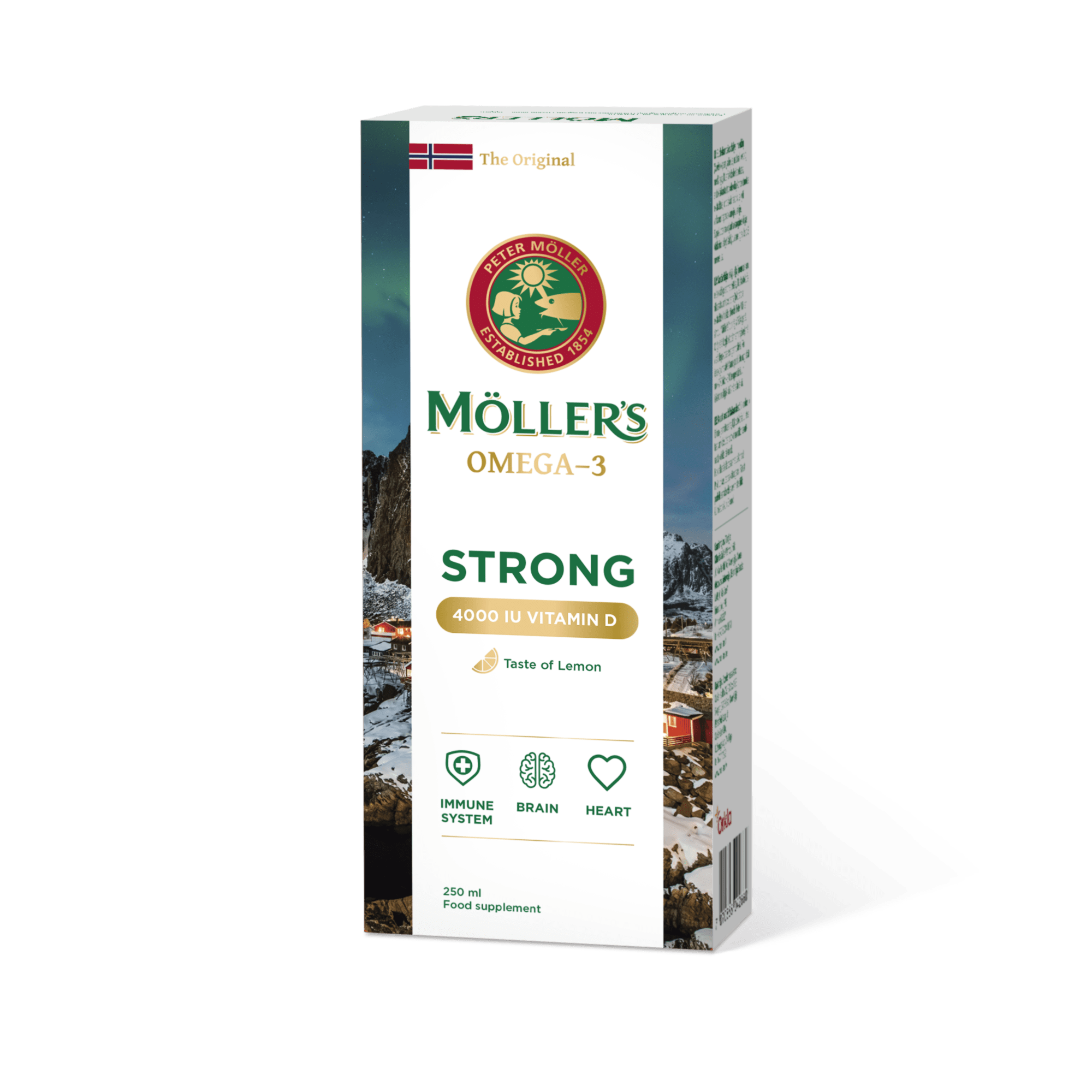 Möller’s Strong Vitamin D sidrunimaitseline kalamaksaõli on valmistatud puhtast tursamaksaõlist ning on A, D ja E vitamiinide allikas. Päevane annus sisaldab kõrges kontsentratsioonis oomega-3 ja vitamiin D. EPA ja DHA aitavad kaasa normaalsele südametalitlusele (1). DHA aitab säilitada normaalset ajutalitlust ja hoida normaalset nägemist (2). Vitamiinid A ja D aitavad kaasa immuunsüsteemi normaalsele talitlusele. Kasuliku toime saavutamiseks on päevas vaja tarbida 1) 250 mg EPA ja DHA 2) 250 mg DHA „Möller‘s“ – oomega-3 eksperdid Norrast.