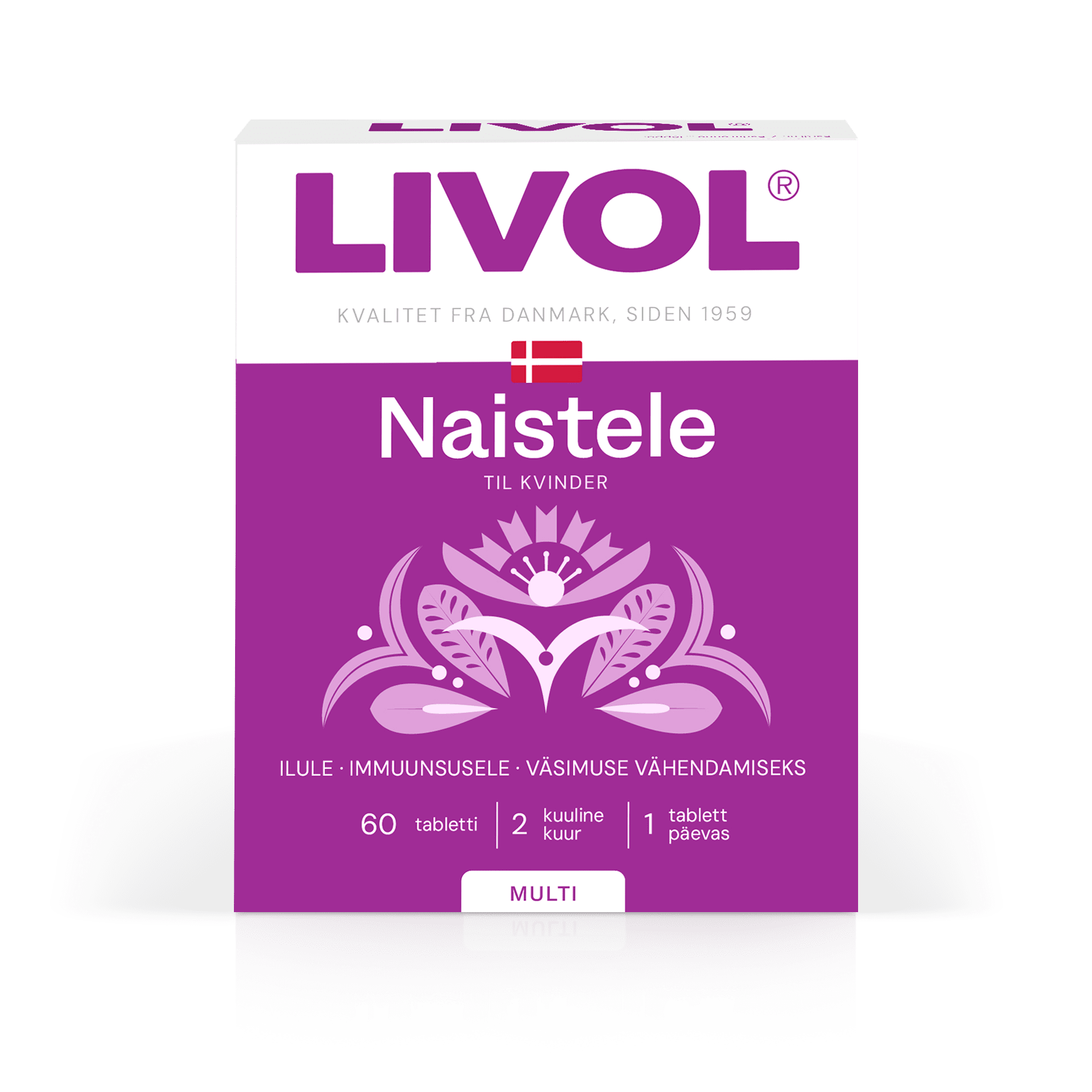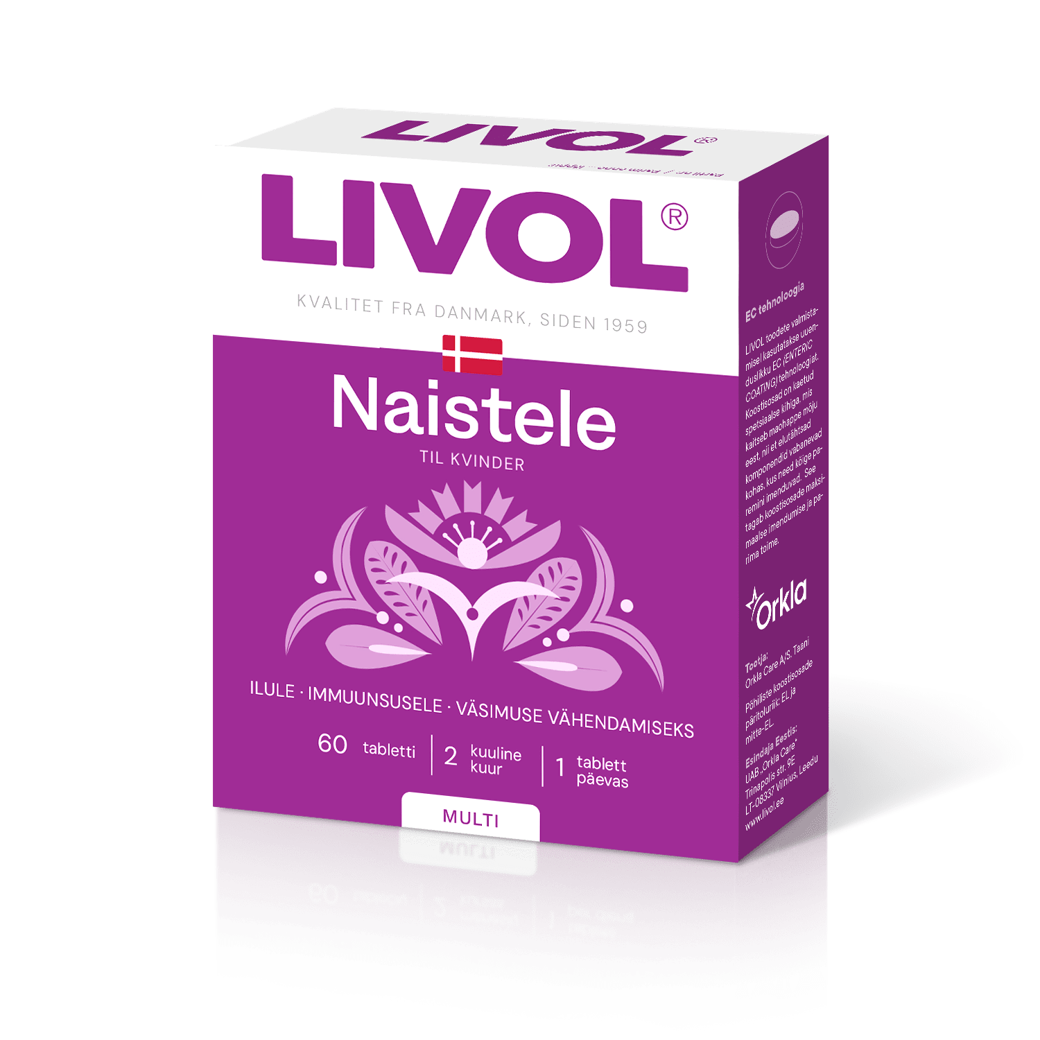 LIVOL MULTI Naistele on kõrgekvaliteediline Taani ekspertide poolt loodud 22 vitamiini ja mineraalaine kompleks naistele. Valmistatud terviklikku lähenemist silmas pidades, arvestades naise organismi vajadusi ning järgides uusimaid Põhjamaade toitumissoovitusi (rohkem infot www.livol.ee)