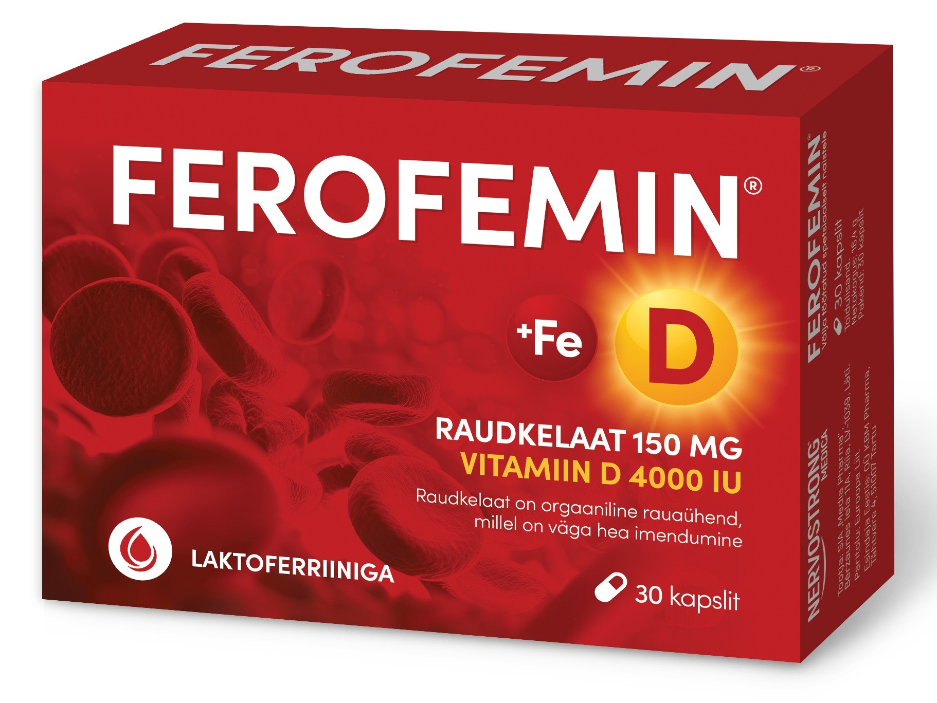 30 kapslit Ferofemin on raua, vitamiinide ja mineraalainete kompleks. Ferofemin sisaldab kelaadi vormis rauda, mis imendub väga hästi. Ferofemin on välja töötatud spetsiaalselt naistele. Raud aitab vähendada väsimust ja kurnatust; aitab kaasa hapniku normaalsele transpordile kehas; aitab kaasa hemoglobiini ja punaste vereliblede normaalsele moodustumisele. Vitamiin D osaleb rakujagunemise protsessis ja aitab kaasa immuunsüsteemi normaalsele talitlusele. Vask aitab kaasa raua normaalsele transpordile kehas. Vitamiin C suurendab raua imendumist.